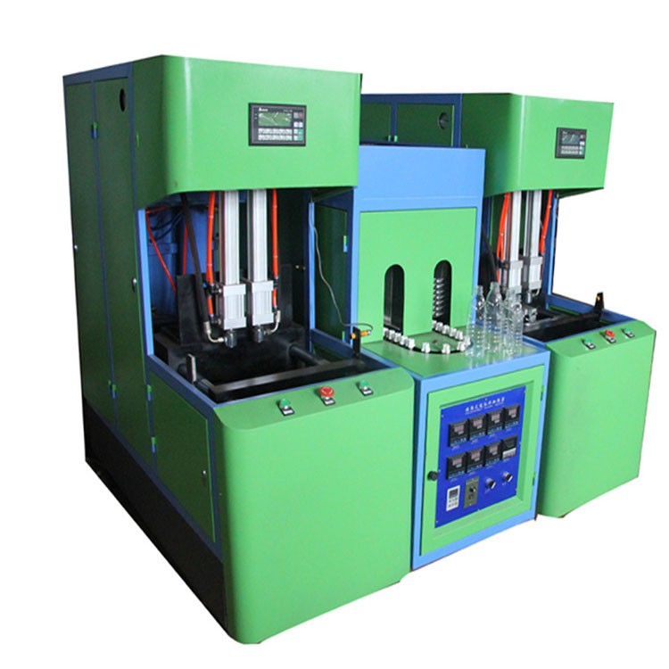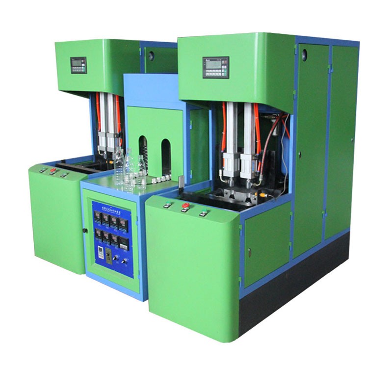 2臺吹瓶機1臺加熱箱,需要配2副模具,2位工人。每小時產(chǎn)量1500-2000瓶。